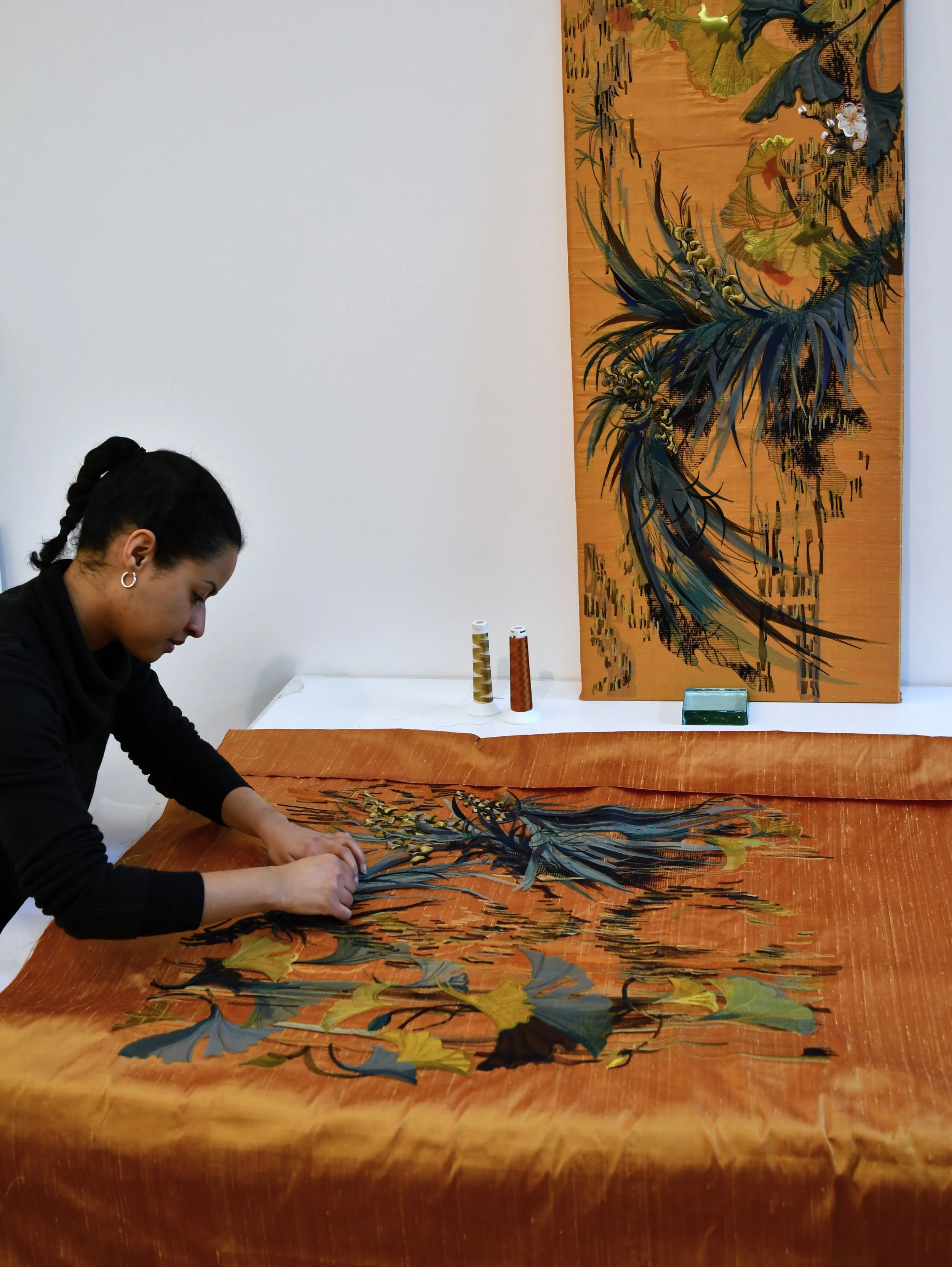 Jacky was commissioned by Atelier Wren to create a series of embroidery and silk panels to sit in the globally acclaimed House of Ming, Chinese restaurant, within the Taj Hotel. Inspired by the culture and history of the Ming Dynasty, she began with textured and detailed drawings inspired by a beautiful Daoist painting from the Ming Dynasty period.